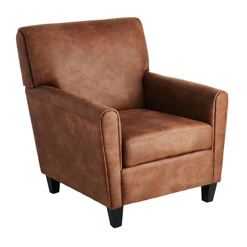Modern farmhouse meets At Home prices in Honeybloom, our exclusive new brand that celebrates life lived together. Take a seat and relax. Accentuate your living space by adding a touch of comfy style with our Dylan faux leather armchair. This chair features a warm brown allover upholstered surface for total comfort.
