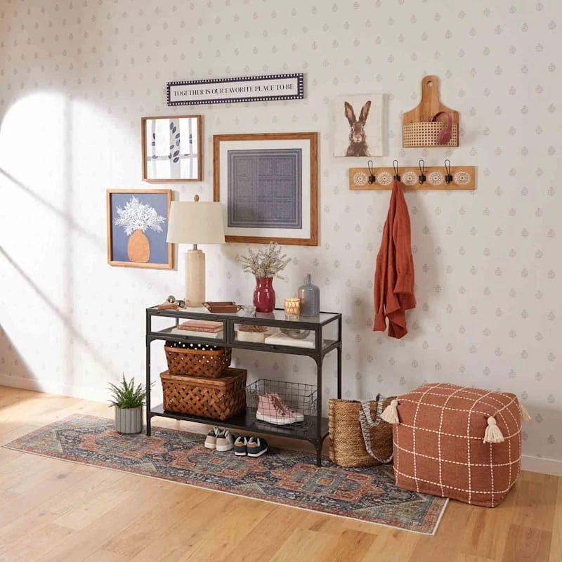 Modern farmhouse meets At Home prices in Honeybloom, our exclusive new brand that celebrates life lived together. Featuring a global-inspired design, our Shiva tasseled square pouf is brimming with loads of exotic charm. A pouf is the perfect addition to any home; itβs convenient, versatile and handy β use as a footrest, as extra seating or as a side table. This piece will add eclectic charm to any room it lands in. The brown and ivory upholstery boasts an allover stitched check motif. Itβs the easy way to add natural charm to your decor.