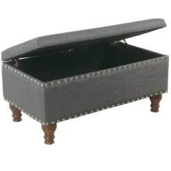 Everybody loves a good ottoman simply for its versatility. A good ottoman can be a handy footrest, spare seat or side table/coffee table stand-in. Our Jasmine linen ottoman can take on one more role, and that’s extra storage! Featuring a classic shape and style, our rectangular Jasmine seat is upholstered in a textured solid-hued dark grey linen-look fabric with wonderful nailhead trim on top and bottom and medium-finish turned legs. The lid lifts to reveal hidden storage; this piece is perfect for tucking away everything from shoes to keepsakes, games and so much more.
